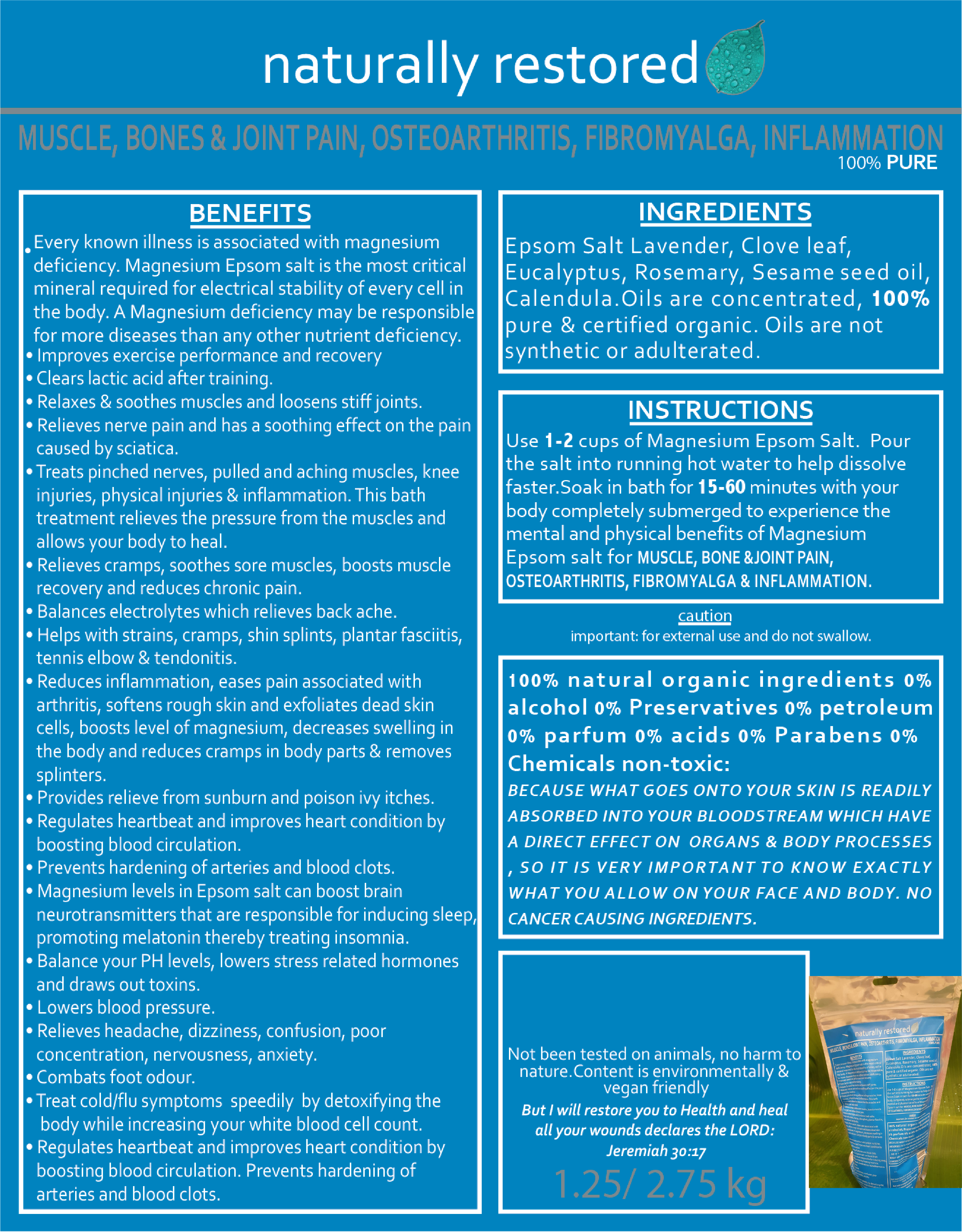 Every known illness is associated with magnesium deficiency. Magnesium Epsom salt is the most critical mineral required for electrical stability of every cell in the body. A Magnesium deficiency may be responsible for more diseases than any other nutrient deficiency. • Improves exercise performance and recovery • Clears lactic acid after training. • Relaxes & soothes muscles and loosens stiff joints. • Relieves nerve pain and has a soothing effect on the pain caused by sciatica. • Treats pinched nerves, pulled and aching muscles, knee injuries, physical injuries & inflammation. This bath treatment relieves the pressure from the muscles and allows your body to heal. • Relieves cramps, soothes sore muscles, boosts muscle recovery and reduces chronic pain. • Balances electrolytes which relieves back ache. • Helps with strains, cramps, shin splints, plantar fasciitis, tennis elbow & tendonitis. • Reduces inflammation, eases pain associated with arthritis, softens rough skin and exfoliates dead skin cells, boosts level of magnesium, decreases swelling in the body and reduces cramps in body parts & removes splinters. • Provides relieve from sunburn and poison ivy itches. • Regulates heartbeat and improves heart condition by boosting blood circulation. • Prevents hardening of arteries and blood clots. • Magnesium levels in Epsom salt can boost brain neurotransmitters that are responsible for inducing sleep. promoting melatonin thereby treating insomnia. • Balance your PH levels, lowers stress related hormones and draws out toxins. • Lowers blood pressure. . Relieves headache, dizziness, confusion, poor concentration, nervousness, anxiety. • Combats foot odour. • Treat cold/flu symptoms speedily by detoxifying the body while increasing your white blood cell count. • Regulates heartbeat and improves heart condition by boosting blood circulation. Prevents hardening of arteries and blood clots.