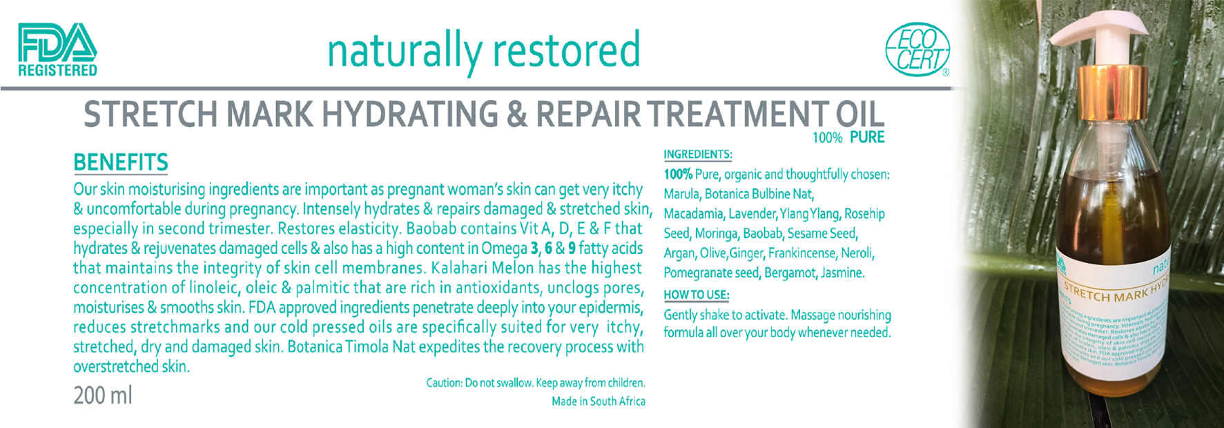 Our skin moisturising ingredients are important as pregnant woman’s skin can get very itchy & uncomfortable during pregnancy. Intensely hydrates & repairs damaged & stretched skin, especially in second trimester. Restores elasticity. Baobab contains Vit A, D, E & F that hydrates & rejuvenates damaged cells & also has a high content in Omega 3, 6 & 9 fatty acids that maintains the integrity of skin cell membranes. Kalahari Melon has the highest concentration of linoleic, oleic & palmitic that are rich in antioxidants, unclogs pores, moisturises & smooths skin. FDA approved ingredients penetrate deeply into your epidermis, reduces stretchmarks and our cold pressed oils are specifically suited for very itchy, stretched, dry and damaged skin. Botanica Timola Nat expedites the recovery process with overstretched skin.