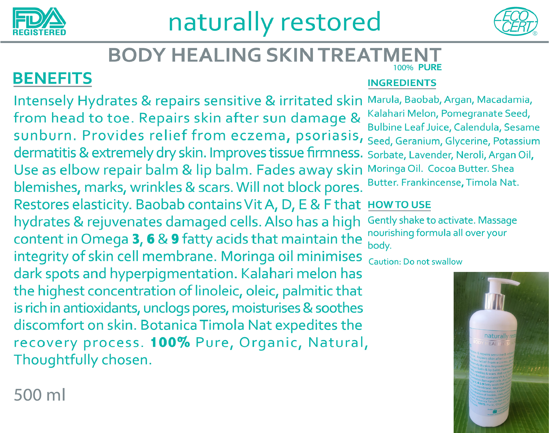 Intensely Hydrates & repairs sensitive & irritated skin from head to toe. Repairs skin after sun damage & sunburn. Provides relief from eczema, psoriasis, dermatitis & extremely dry skin. Improves tissue firmness. Use as elbow repair balm & lip balm. Fades away skin blemishes, marks, wrinkles & scars. Will not block pores. Restores elasticity. Baobab contains Vit A, D, E & Fthat hydrates & rejuvenates damaged cells. Also has a high content in Omega 3, 6 & 9 fatty acids that maintain the integrity of skin cell membrane. Moringa oil minimises dark spots and hyperpigmentation. Kalahari melon has the highest concentration of linoleic, oleic, palmitic that is rich in antioxidants, unclogs pores, moisturises & soothes discomfort on skin. Botanica Timola Nat expedites the recovery process. 100% Pure, Organic, Natural Thoughtfully chosen. 500 ml