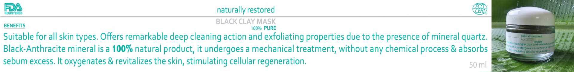 Suitable for all skin types. Offers remarkable deep cleaning action and exfoliating properties due to the presence of mineral quartz. Black-Anthracite mineral is a 100% natural product, it undergoes a mechanical treatment, without any chemical process & absorbs sebum excess. It oxygenates & revitalizes the skin, stimulating cellular regeneration. 50 ml